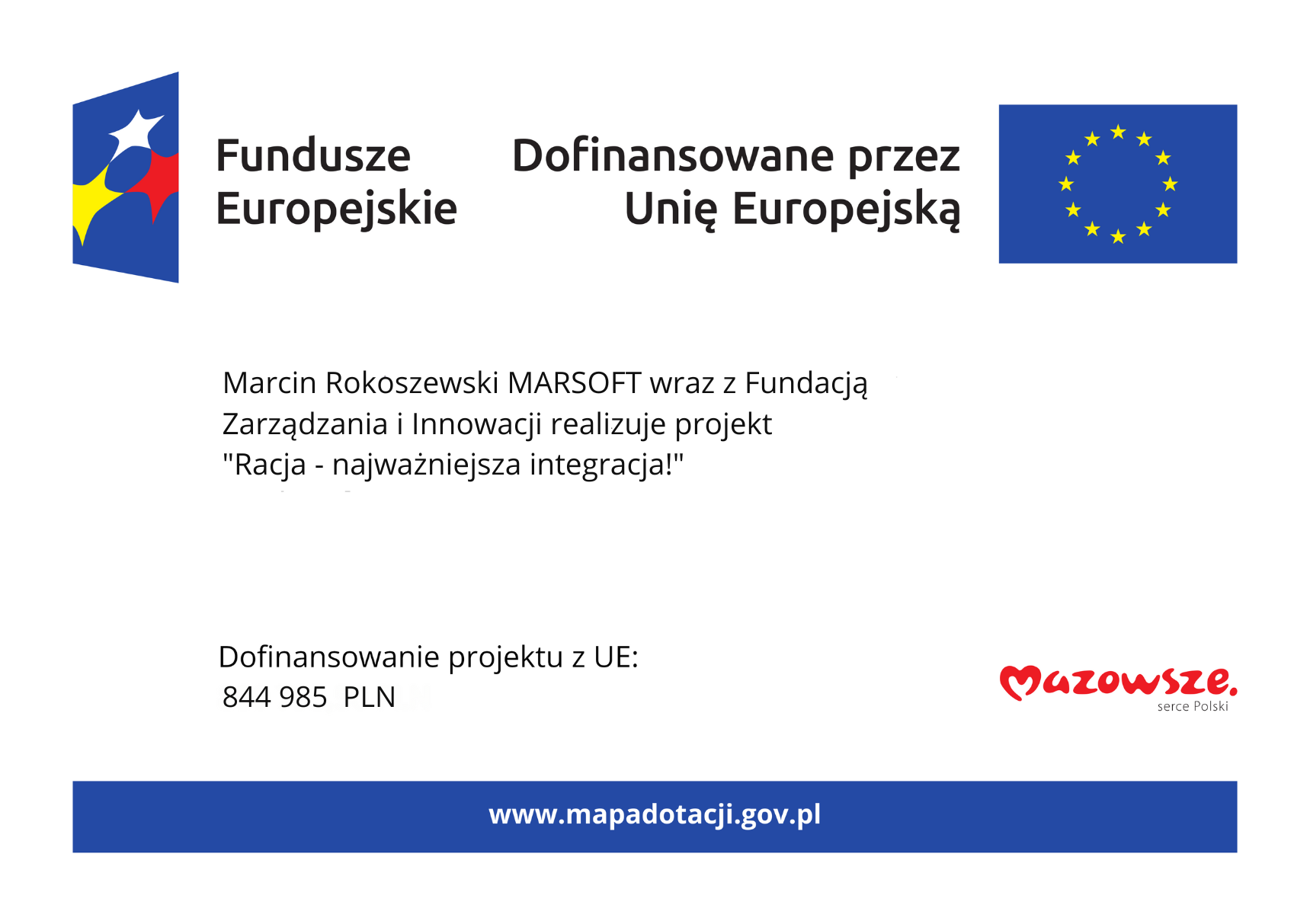 Marcin Rokoszewski ,,MARSOFT” wraz z partnerem Fundacją Zarządzania i Innowacji serdecznie zapraszają do udziału w projekcie pt. „Racja-najważniejsza integracja!” nr FEMA.08.04-IP.01-020X/24 realizowanym na terenie województwa mazowieckiego.